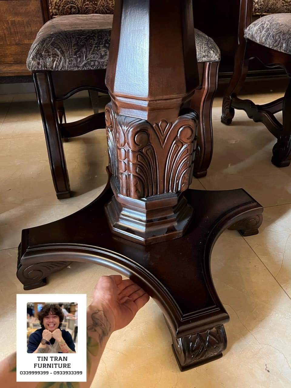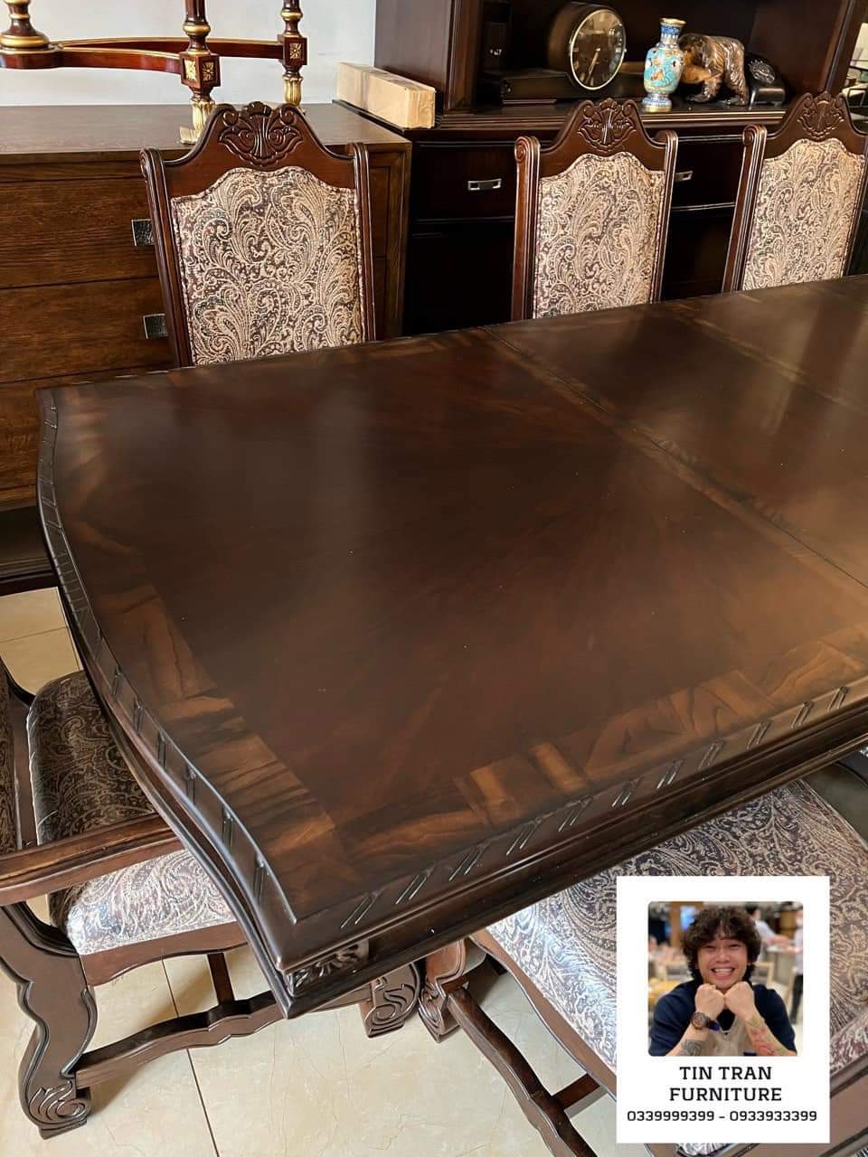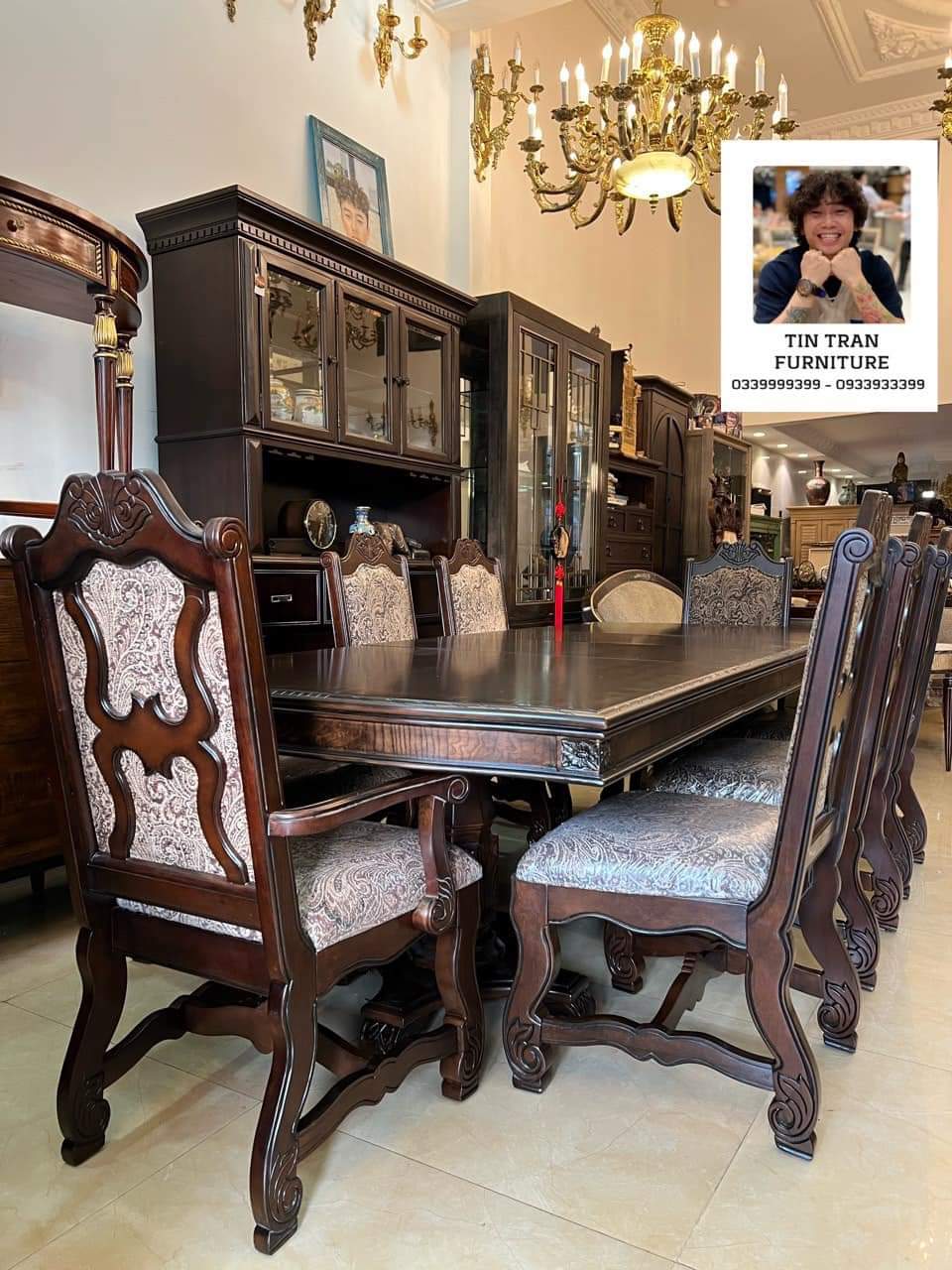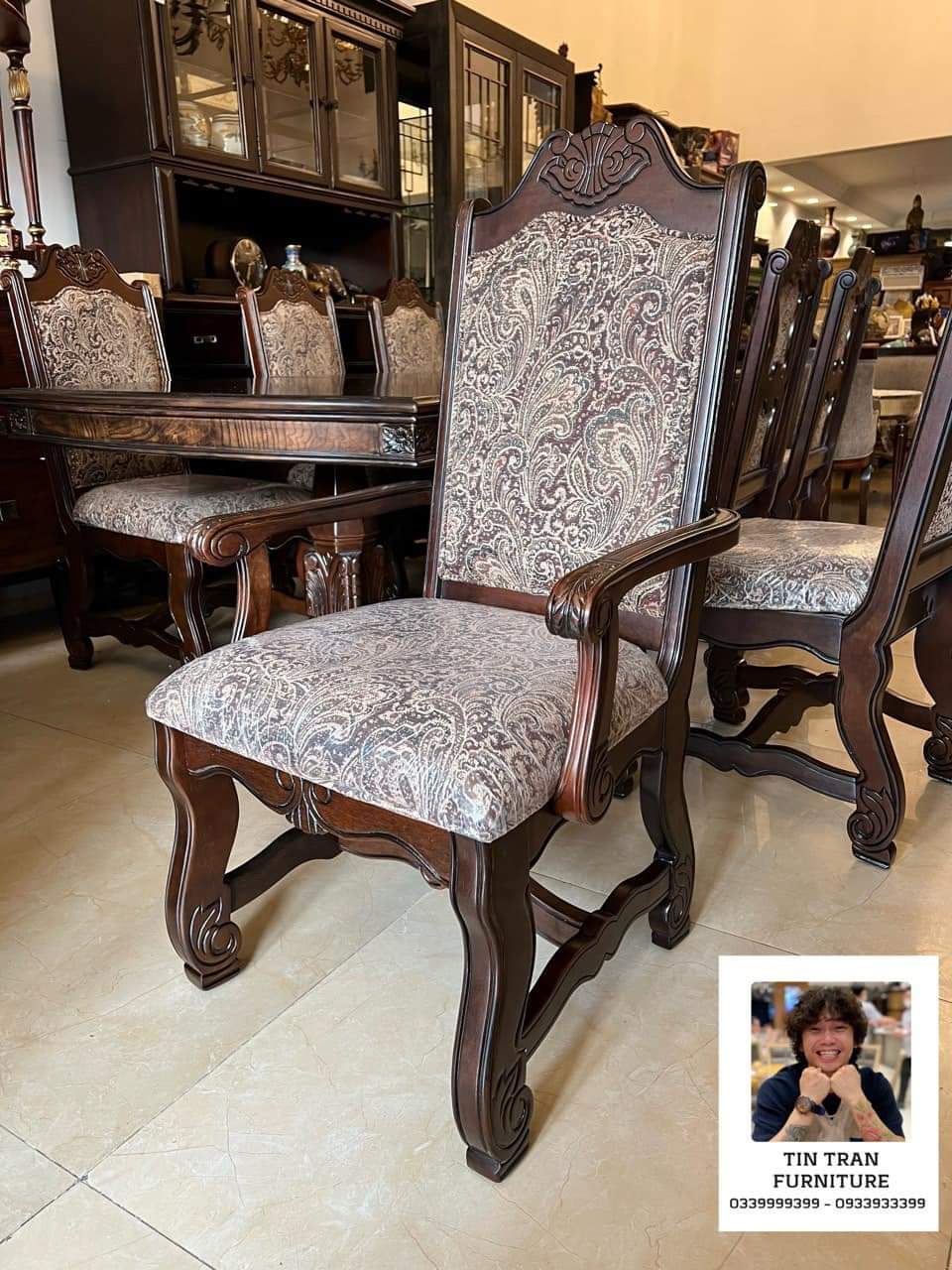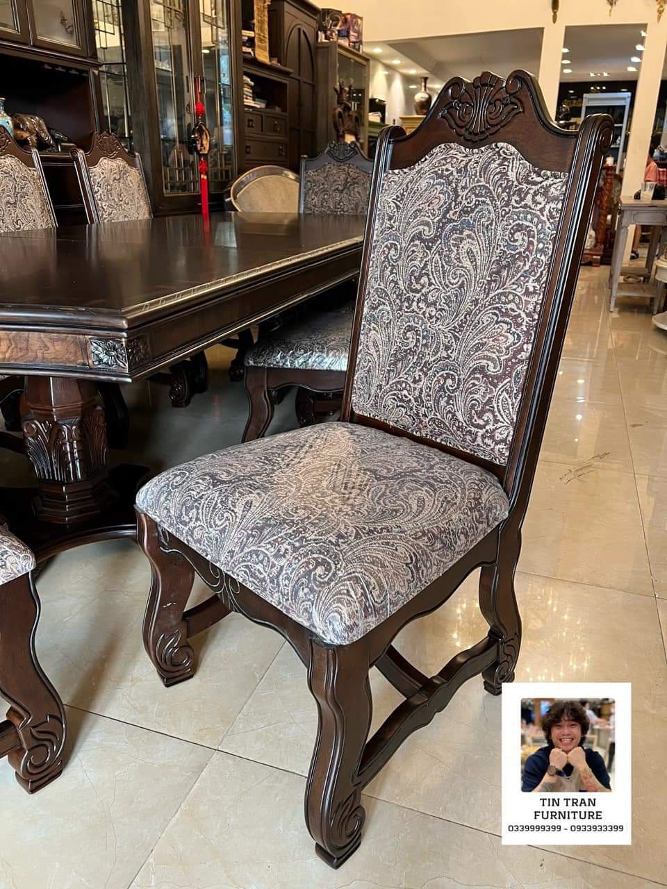 Bộ bàn ghế Pula BGA33 Renaissance Ý, chất liệu gỗ quí Xoan Đào hồng, màu sơn nâu đỏ cực đẹp, nhìn ở ngoài đẹp hơn trong ảnh, vải bọc ghế floral embroidery, bàn có thể kéo giãn dc 3 kích thước dài 180cm, 220cm, 270cm, rộng 110cm cao 78cm.