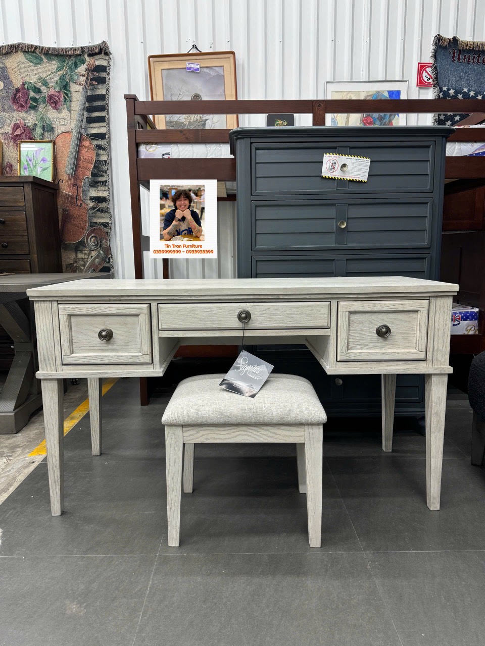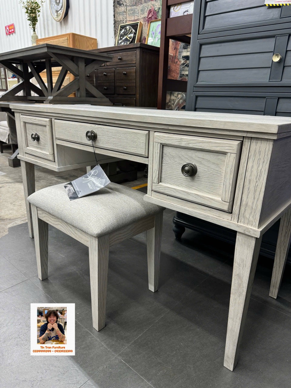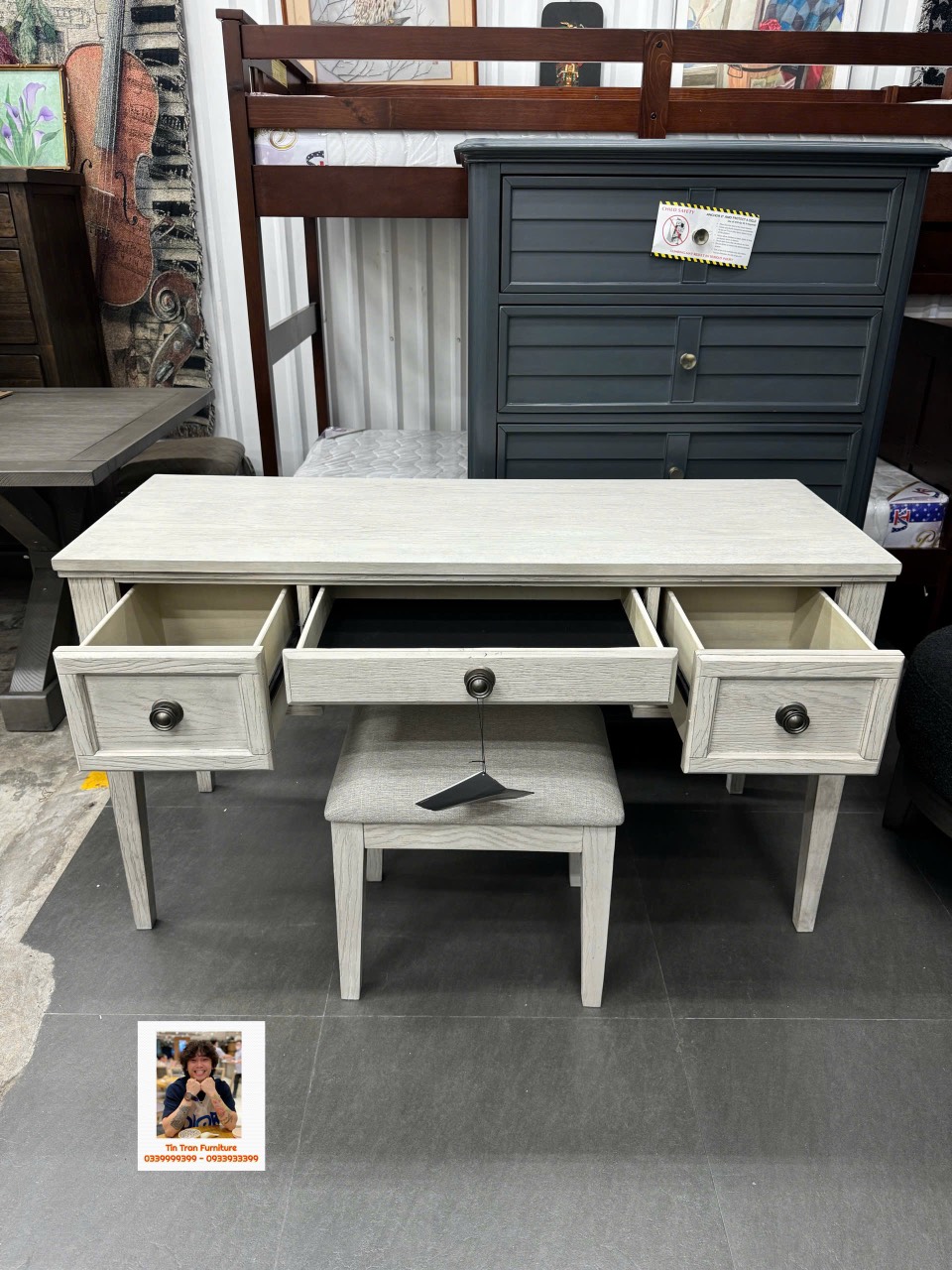 😳 3.5triệu/bộ.Bộ bàn ghế làm việc thương hiệu Ashley Mỹ 🇺🇸 phong cách thanh lịch trang nhã, đẹp vượt thời gian, được làm bằng gỗ, gỗ sồi veneer, sơn màu trắng cổ điển họa tiết vân gỗ, 3 ngăn kéo trượt êm ái với cấu trúc mộng đuôi chim và thanh trượt bên bi kim loại, núm màu đồng sẫm, đệm ghế bọc vải polyester, hàng chính hàng mới nguyên thùng ship toàn quốc 350k, ship nội ô sg rẻ hơn..