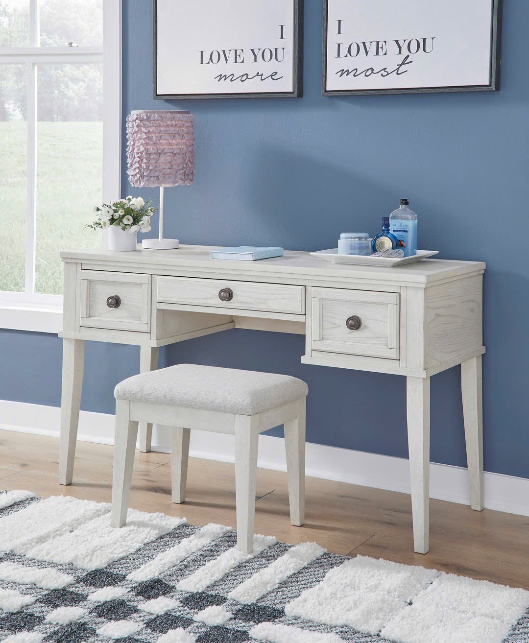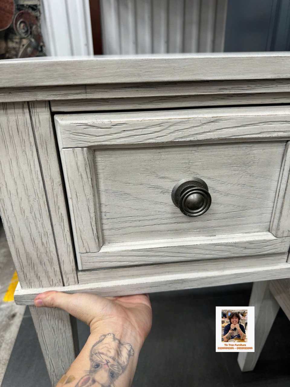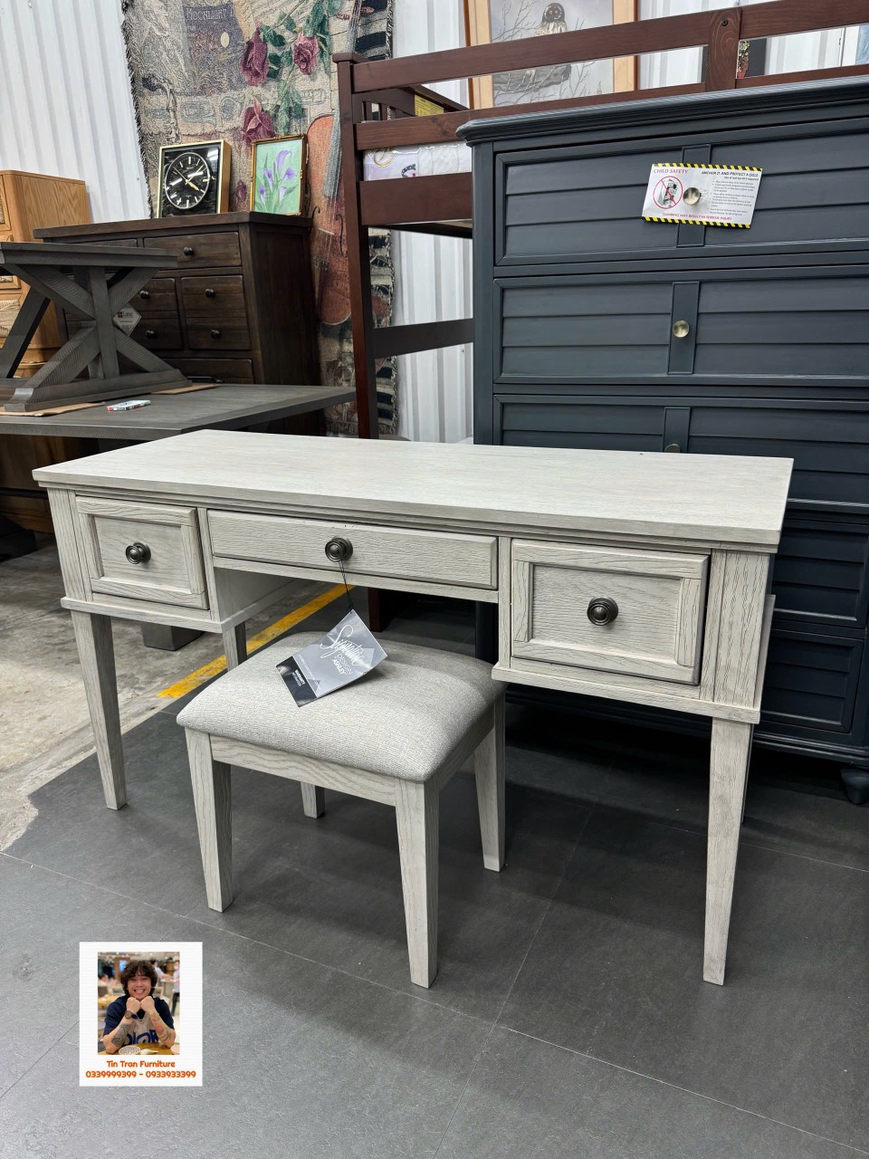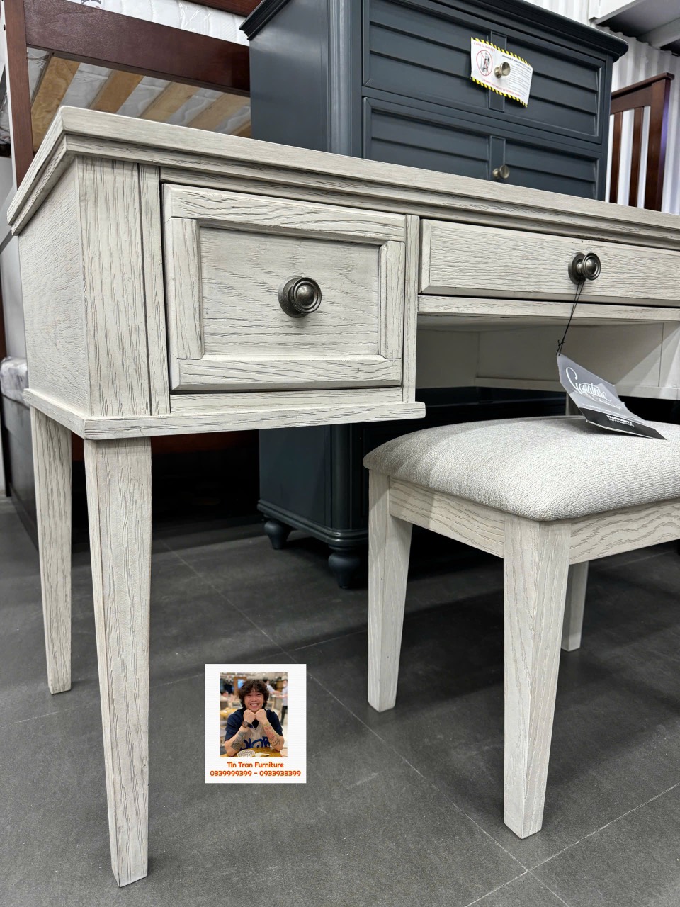 😳 3.5triệu/bộ.Bộ bàn ghế làm việc thương hiệu Ashley Mỹ 🇺🇸 phong cách thanh lịch trang nhã, đẹp vượt thời gian, được làm bằng gỗ, gỗ sồi veneer, sơn màu trắng cổ điển họa tiết vân gỗ, 3 ngăn kéo trượt êm ái với cấu trúc mộng đuôi chim và thanh trượt bên bi kim loại, núm màu đồng sẫm, đệm ghế bọc vải polyester, hàng chính hàng mới nguyên thùng ship toàn quốc 350k, ship nội ô sg rẻ hơn..