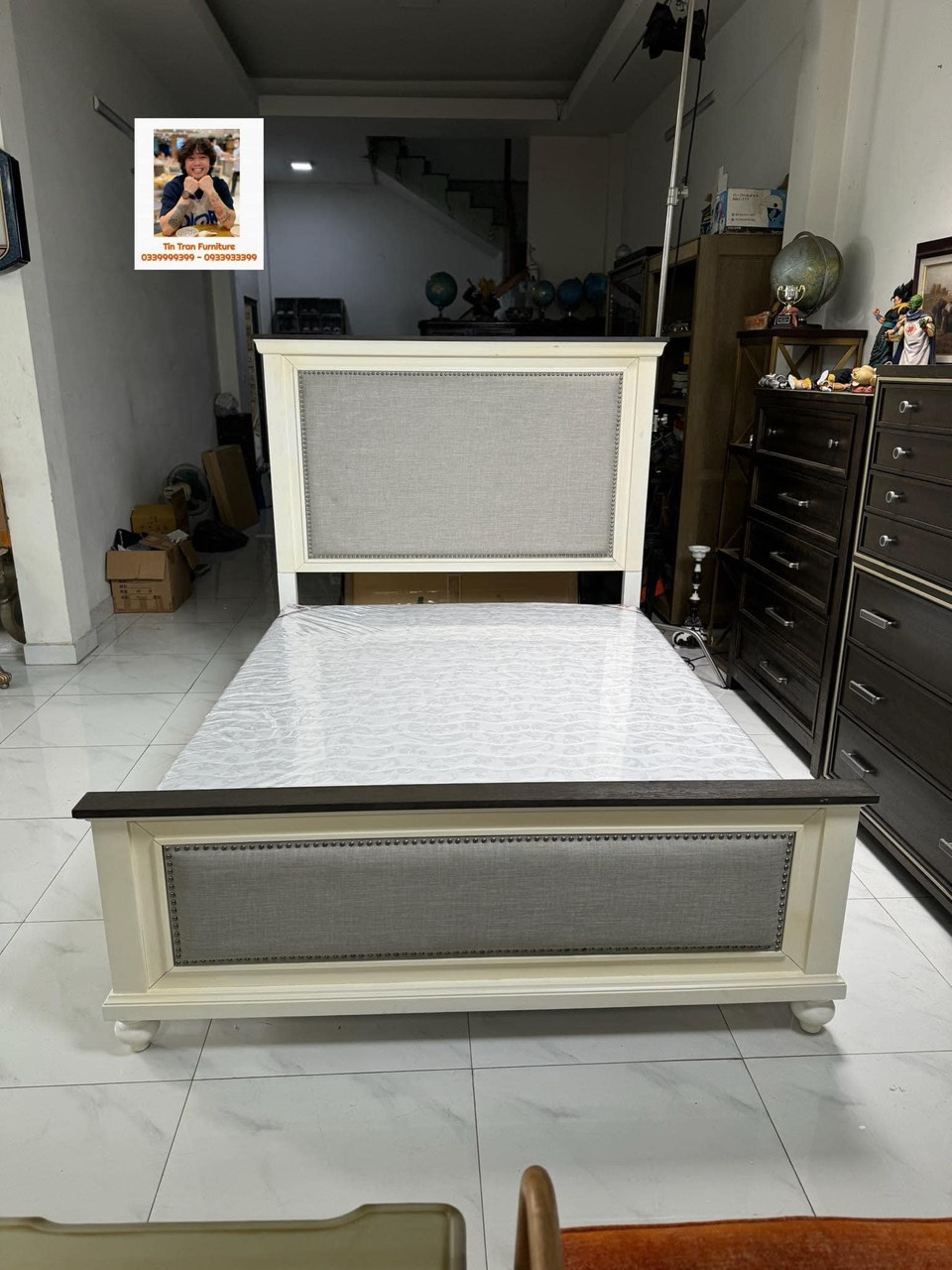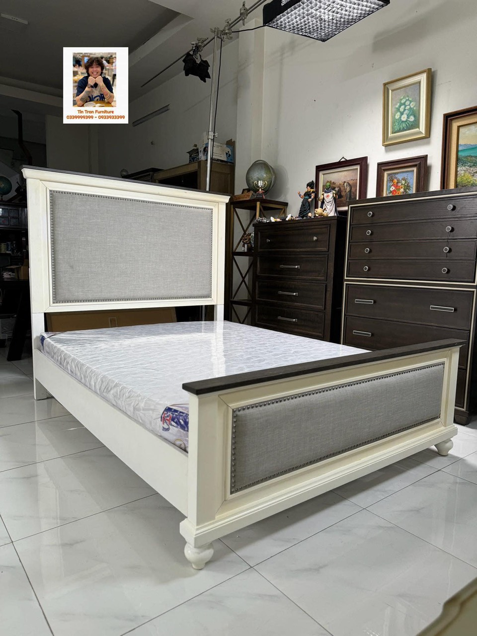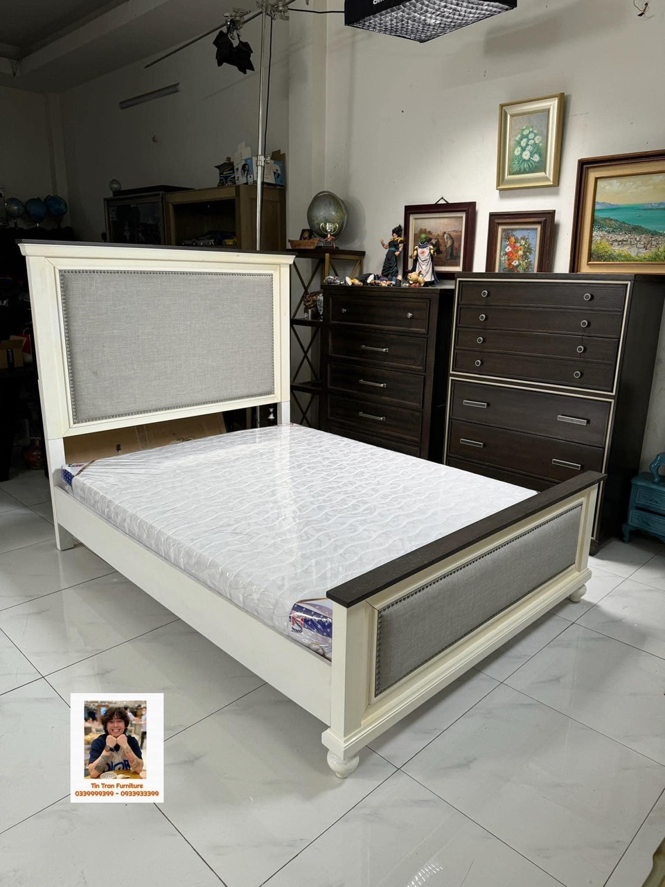 🇺🇸 Giường thương hiệu HomeFurniture Mỹ 🇺🇸 chất liệu gỗ cao su, đầu giường bọc vải bố, hàng mới nguyên thùng ship toàn quốc.