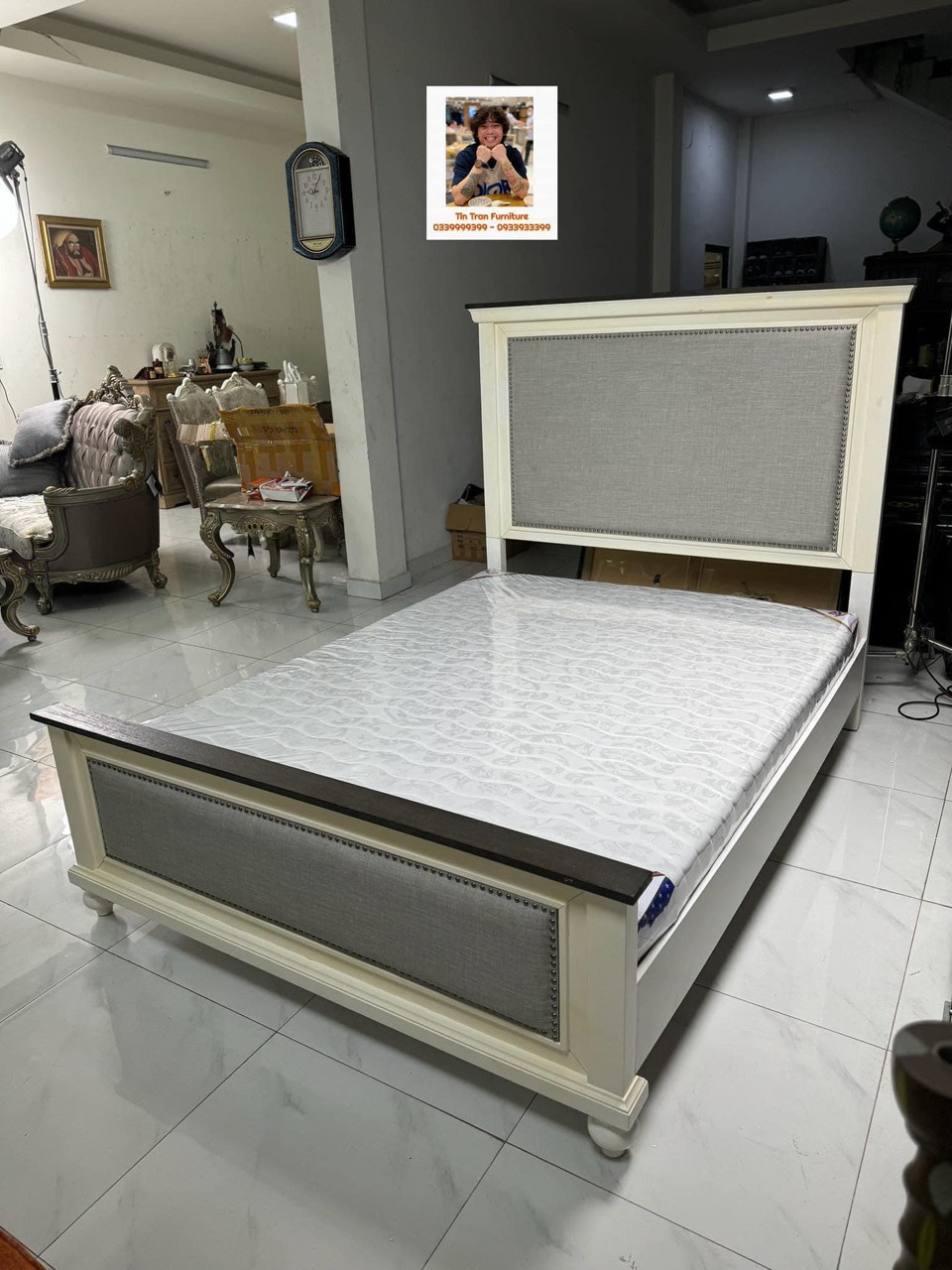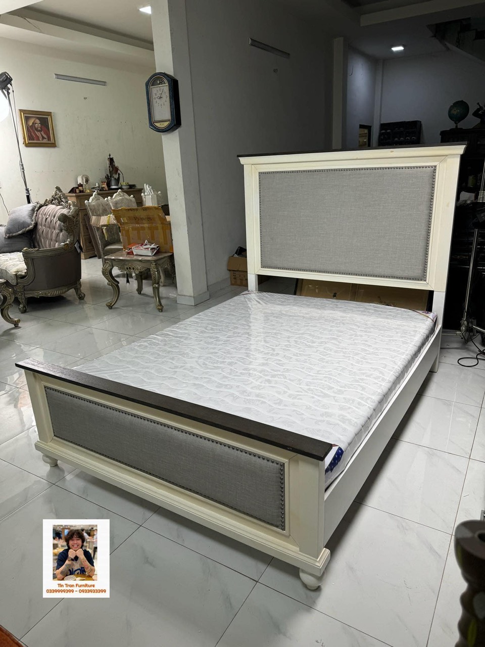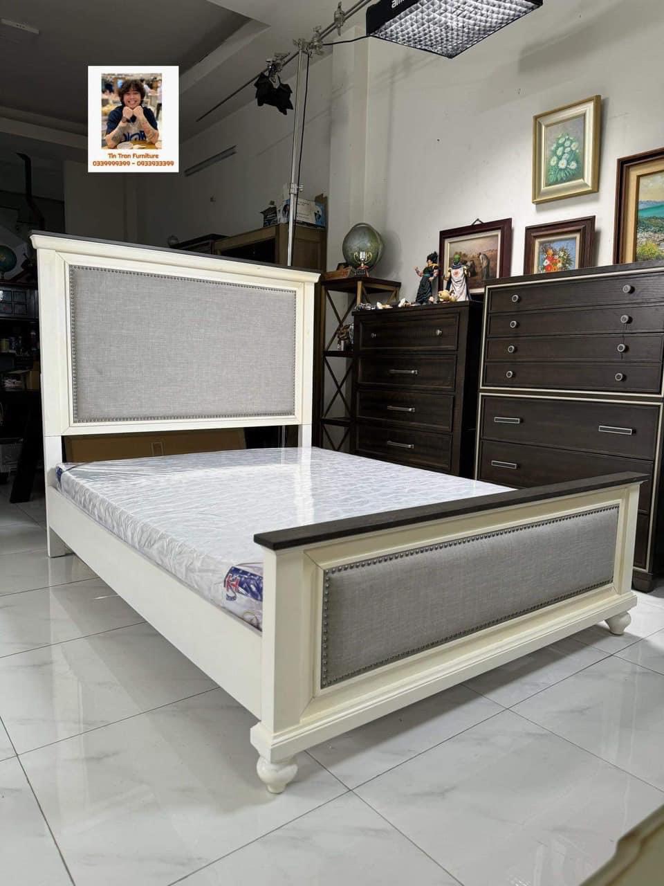 🇺🇸 Giường thương hiệu HomeFurniture Mỹ 🇺🇸 chất liệu gỗ cao su, đầu giường bọc vải bố, hàng mới nguyên thùng ship toàn quốc.