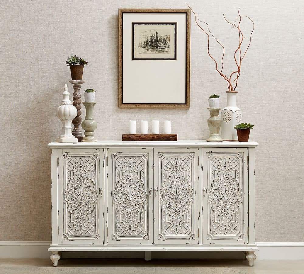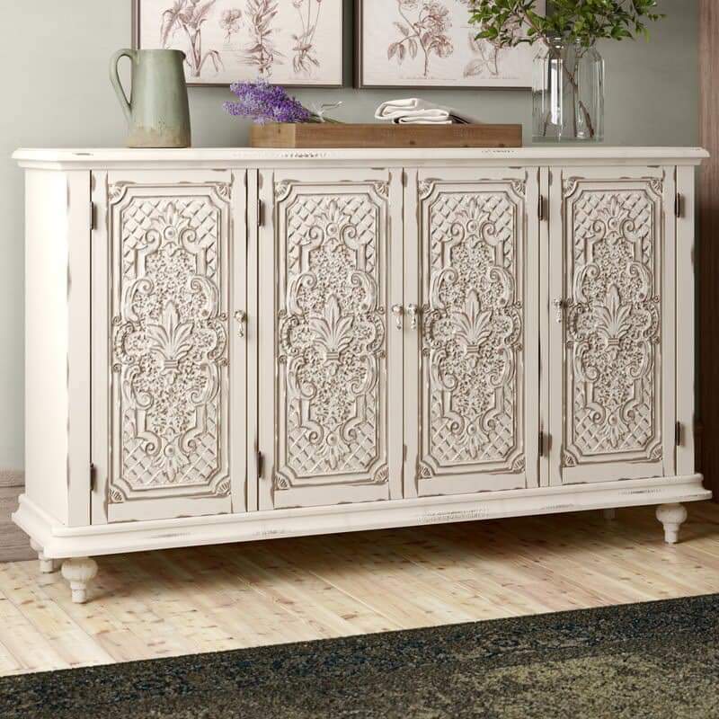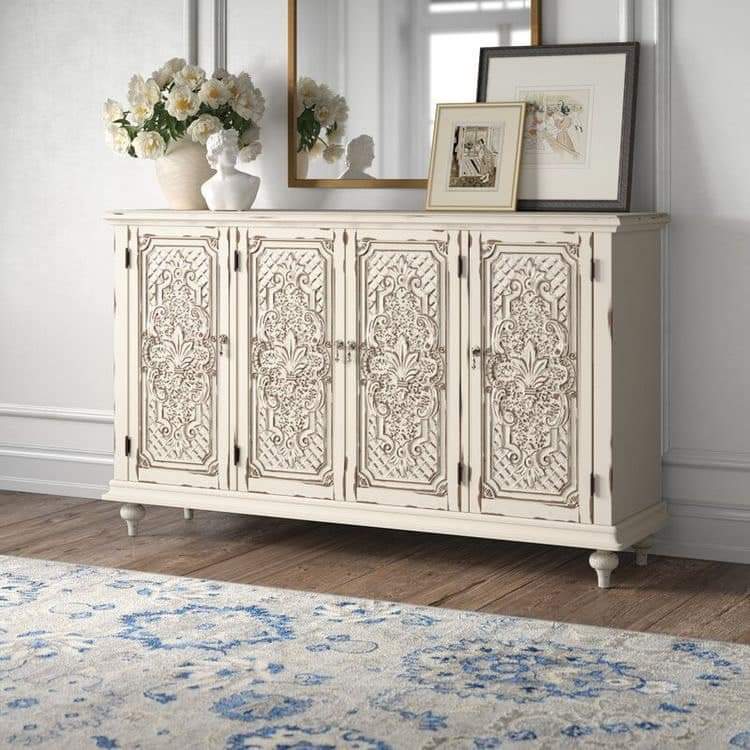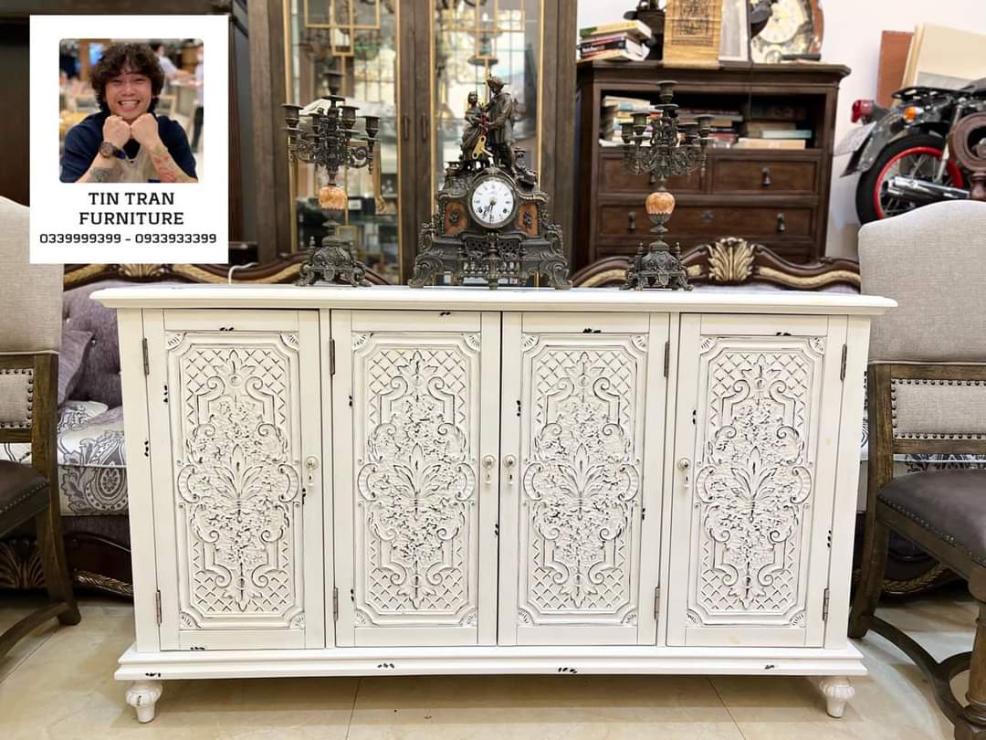 Được thiết kế thi công theo kiểu cổ điển xưa cũ, bốn cánh cửa gỗ dc sơn tạo kiểu dấu ấn thời gian rất công phu, tủ sử dụng linh hoạt, từ phòng ăn đến phòng làm việc đều đẹp