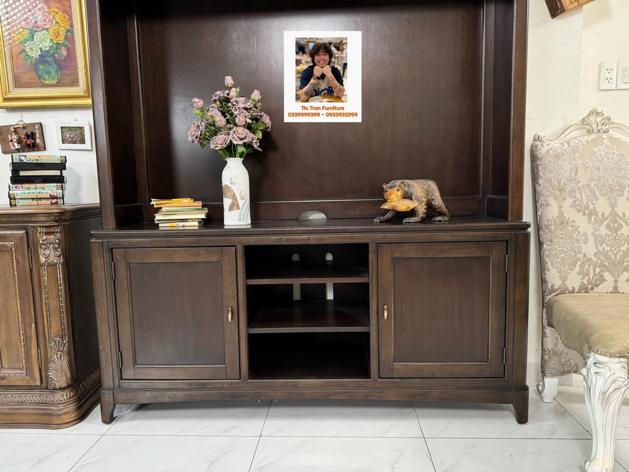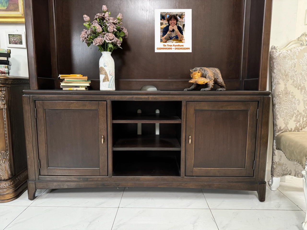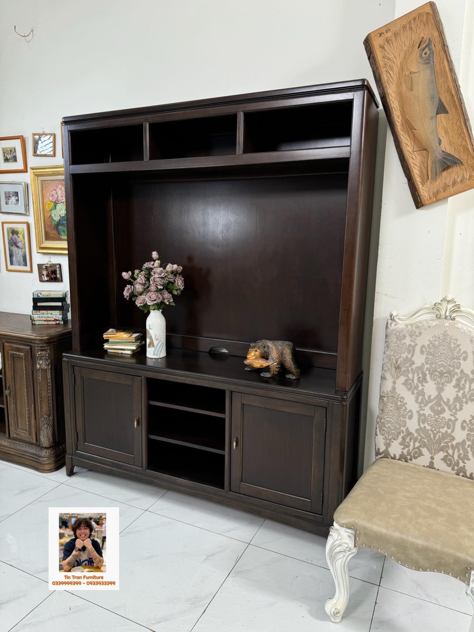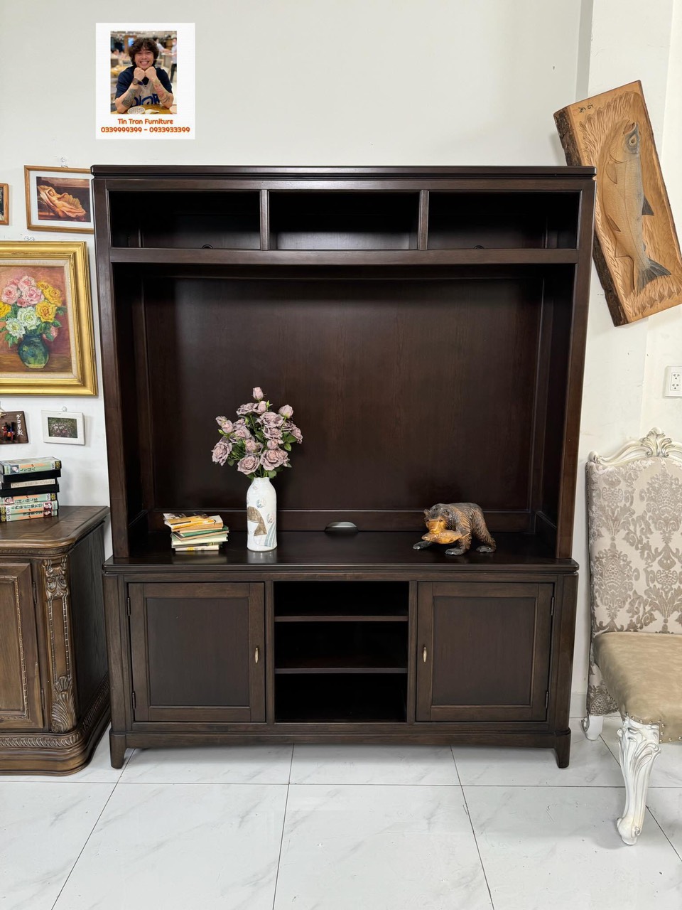 Kthuoc : cao tổng thể 208cm * ngang 166cm * sâu 46cm, dùng cho tivi 65inch trở xuống.
