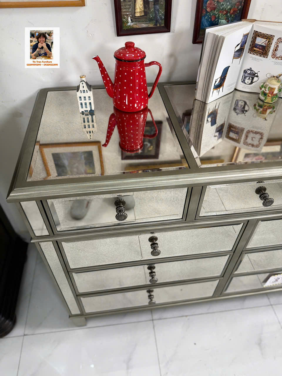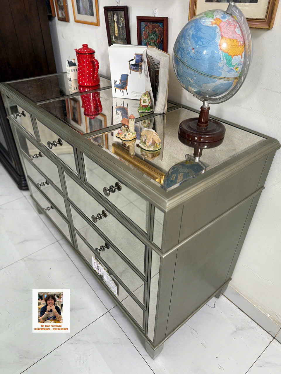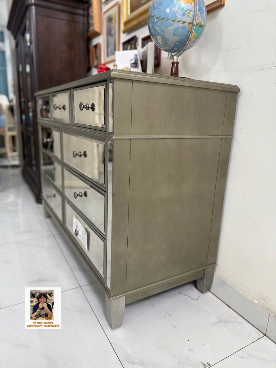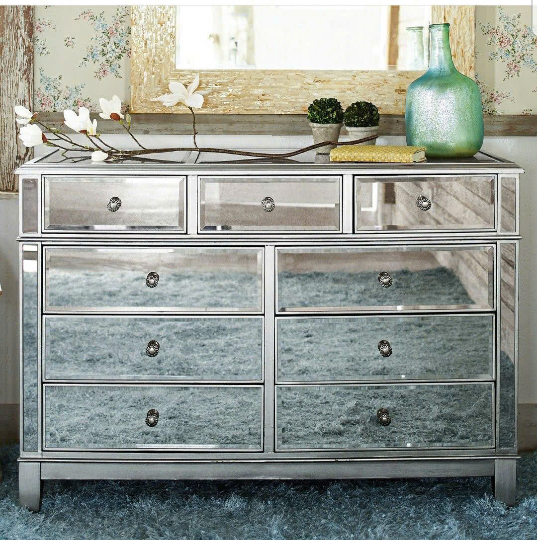🇺🇸 Cực phẩm tủ trang trí với kỹ thuật tráng gương bạc cổ điển, gương có độ mờ đặc biệt lạ mắt, tay nắm hộc tủ hoa văn chi tiết sắc nét tinh tế, chất liệu gỗ cao su ốp gương mặt trước và mặt trên, tủ có độ sâu 54cm đựng dc rất nhiều đồ, hành xịn chính hãng mới nguyên thùng ship toàn quốc.