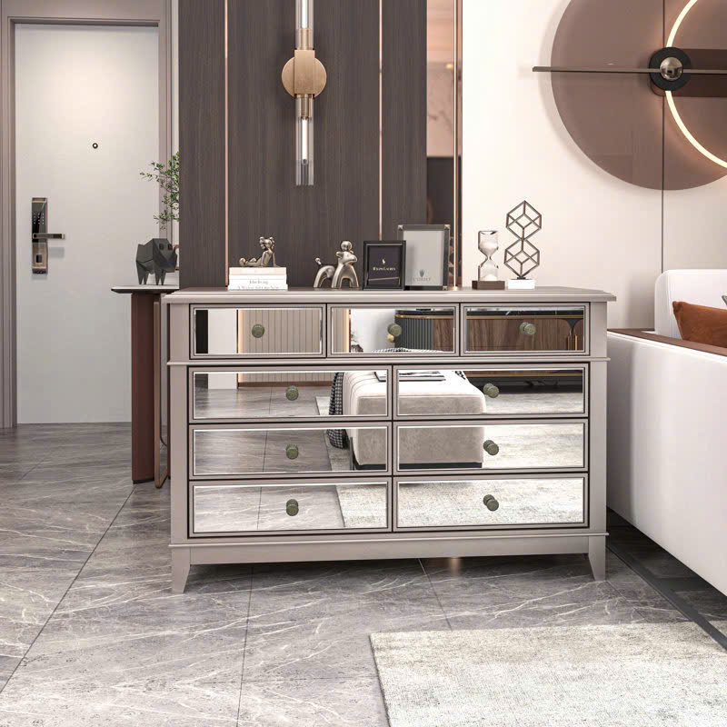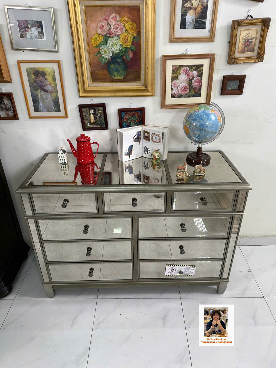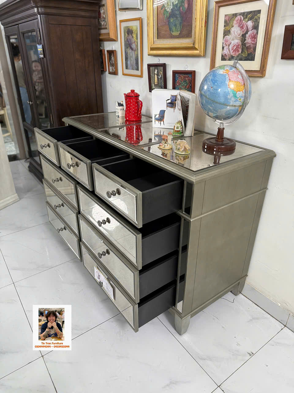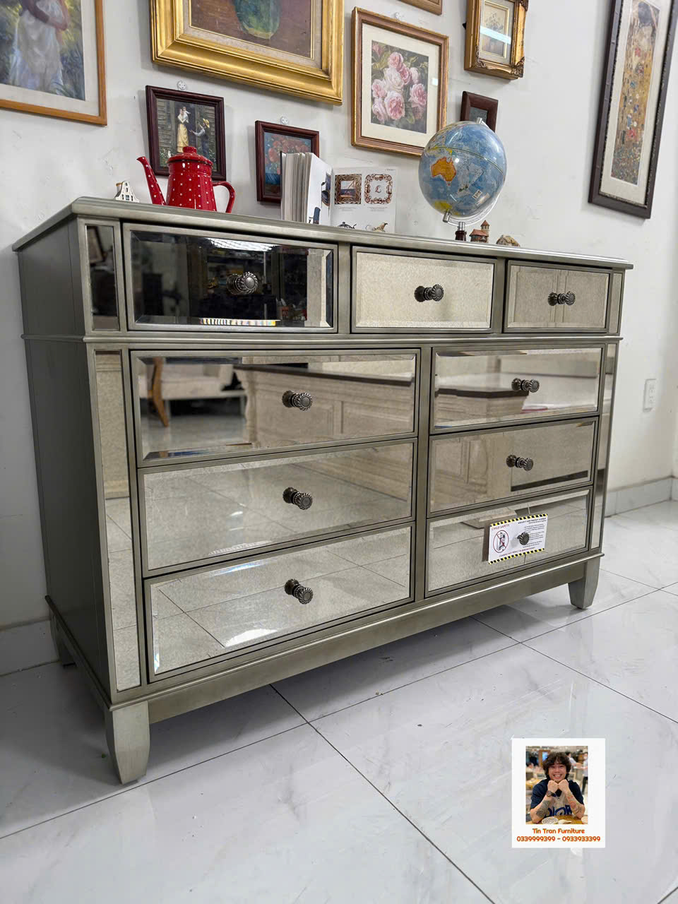🇺🇸 Cực phẩm tủ trang trí với kỹ thuật tráng gương bạc cổ điển, gương có độ mờ đặc biệt lạ mắt, tay nắm hộc tủ hoa văn chi tiết sắc nét tinh tế, chất liệu gỗ cao su ốp gương mặt trước và mặt trên, tủ có độ sâu 54cm đựng dc rất nhiều đồ, hành xịn chính hãng mới nguyên thùng ship toàn quốc.